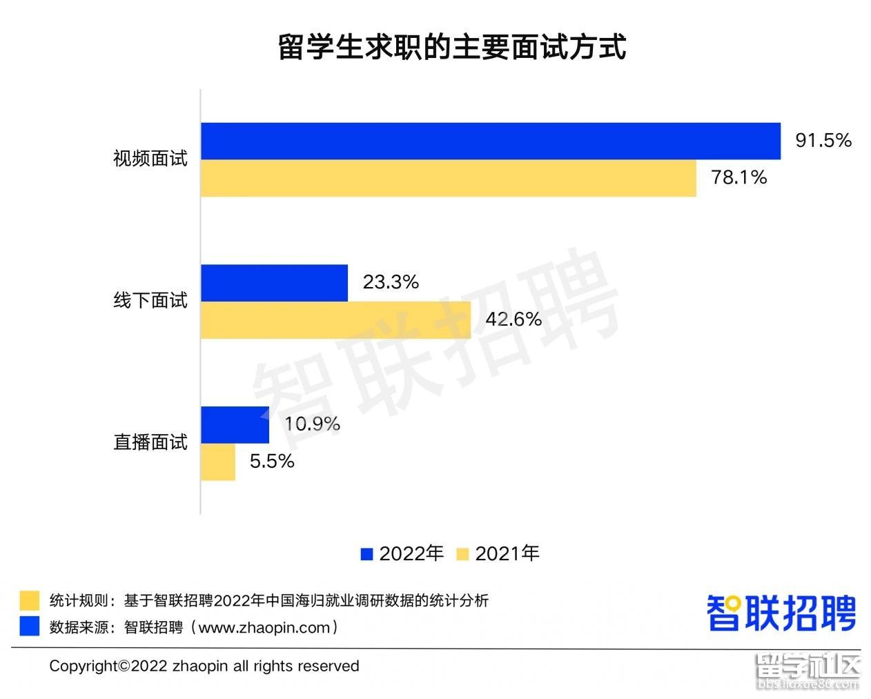 疫情防控三年來,越來越多留學(xué)生通過可視化方式進(jìn)行面試。2022年,有91.5%的留學(xué)生表示自己的主要面試方式為視頻面試,高于2021年的78.1%,并超越線下面試(23.3%)。也有10.9%的留學(xué)生運用直播面試這種新方式與招聘方進(jìn)行溝通。由于視頻面試/直播面試能打破時空限制,幫助留學(xué)生足不出戶拿offer,因此備受留學(xué)生青睞。