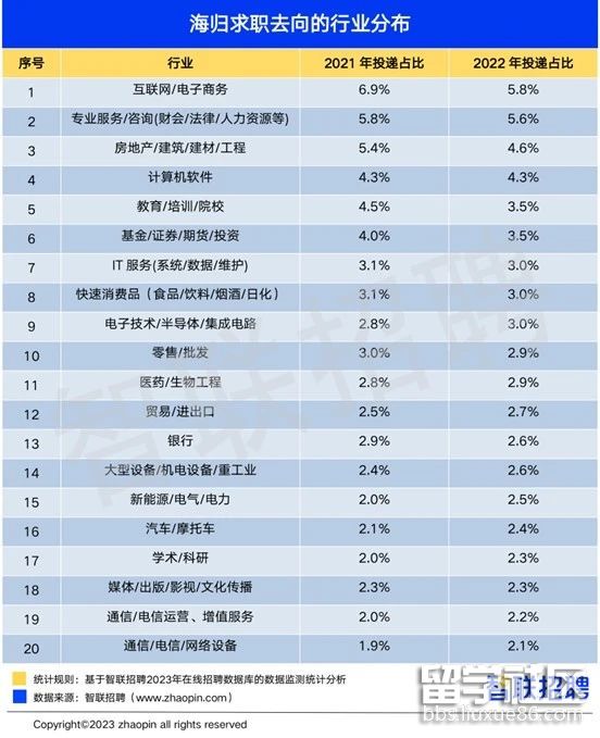 行業(yè)方面,2022年向互聯(lián)網(wǎng)/電子商務(wù)行業(yè)和專業(yè)服務(wù)/咨詢行業(yè)投遞的海歸占比最高,分別為5.8%、5.6%,排名與2021年保持一致。這表明,IT和專業(yè)服務(wù)領(lǐng)域?qū)α魧W(xué)生的就業(yè)吸附能力依然很強。