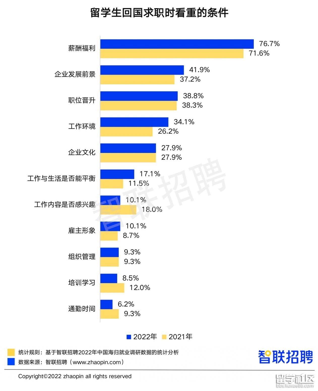 關(guān)于回國求職看重的條件,2022年留學(xué)生依然最看重“薪酬福利”,占比76.7%,比2021年的71.6%有所提高。不過,除了薪酬福利,留學(xué)生回國求職還注重多元因素,41.9%的留學(xué)生關(guān)注企業(yè)發(fā)展前景,這一比例較2021年有所提高。留學(xué)生對“工作環(huán)境”“工作與生活是否能平衡”“雇主形象”等因素的關(guān)注度均比2021年有所提高。這表明,留學(xué)生正從更多維的工作體驗上對職位進(jìn)行衡量。