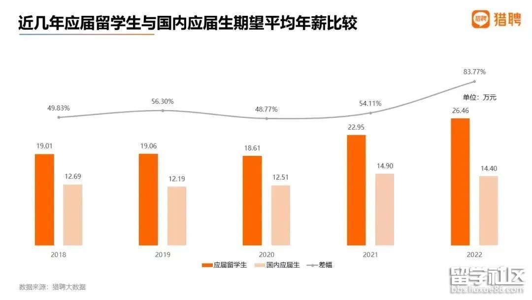 根據(jù)前不久獵聘剛剛發(fā)布的《2022年度就業(yè)趨勢數(shù)據(jù)報告》,應(yīng)屆留學(xué)生的期望薪資比國內(nèi)應(yīng)屆生高出整整83.77%。