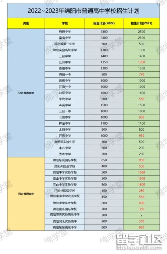 大多數(shù)高中招生人數(shù)與去年相同,4所學(xué)??s招,12所學(xué)校擴(kuò)招。綿中實(shí)驗(yàn)、南山實(shí)驗(yàn)兩所學(xué)校變化巨大,招生計(jì)劃人數(shù)足足擴(kuò)充到了去年的三倍之多。兩年詳細(xì)數(shù)據(jù)對(duì)比請(qǐng)看下圖(三臺(tái)實(shí)驗(yàn)、博美、潤(rùn)禾更正,請(qǐng)看評(píng)論區(qū))。