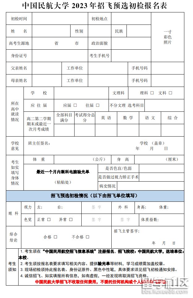 5.招飛預(yù)選初檢過程實(shí)行單項(xiàng)淘汰,無需空腹,全程不收取任何費(fèi)用,交通、食宿自理。中國民航大學(xué)從未委托任何培訓(xùn)機(jī)構(gòu)或個(gè)人開展招飛工作。