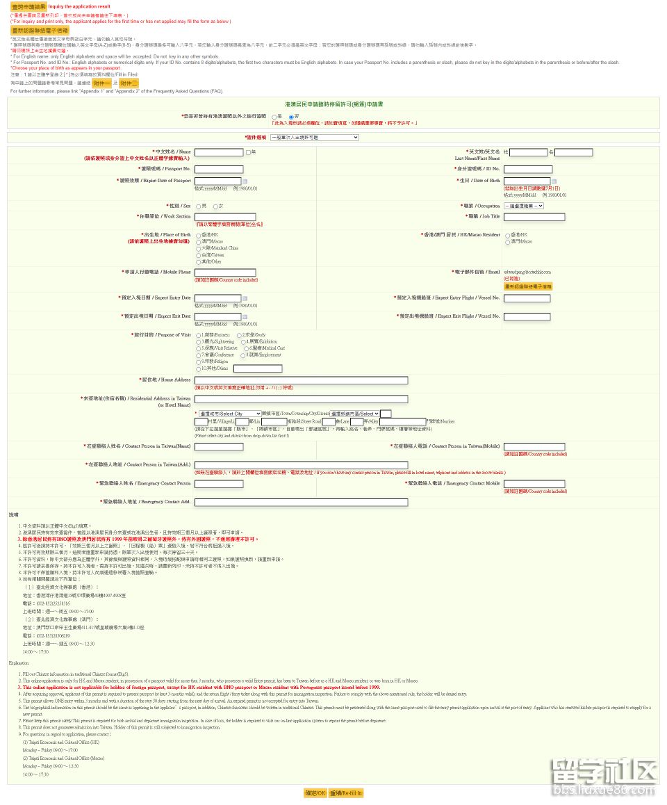 申請(qǐng)人必須持有效期3個(gè)月以上之港澳特區(qū)護(hù)照,除了一般個(gè)人資料外,大家需于表格上填上入境目的以及在臺(tái)灣的其中一個(gè)住址或旅館名稱。