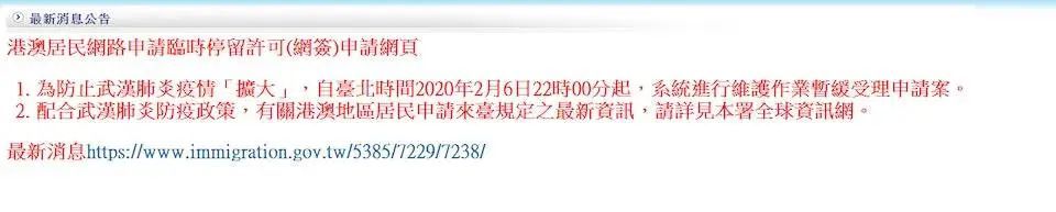 于港澳出生且預(yù)計(jì)逗留臺(tái)灣不超過(guò)30日的港澳特區(qū)護(hù)照持有人,以及非港、澳出生但曾于1983年后以港澳永久居民身份赴臺(tái)的人,于2月20日起可以透過(guò)臺(tái)灣地區(qū)移民署網(wǎng)站申請(qǐng)「入臺(tái)證」。(系統(tǒng)現(xiàn)時(shí)暫未開(kāi)放)