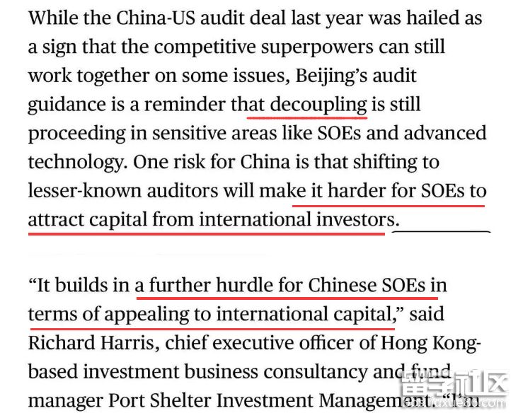 彭博社還引用第三方人士的評(píng)論直接稱(chēng),雖然去年中美審計(jì)協(xié)議被譽(yù)為競(jìng)爭(zhēng)性超級(jí)大國(guó)仍能在某些問(wèn)題上合作的標(biāo)志,但中國(guó)的“審計(jì)指導(dǎo)”是在搞“脫鉤”。如這樣做,中國(guó)將面臨的風(fēng)險(xiǎn)是:改聘不太知名的審計(jì)機(jī)構(gòu)將使國(guó)有企業(yè)更難吸引國(guó)際投資者的資金。