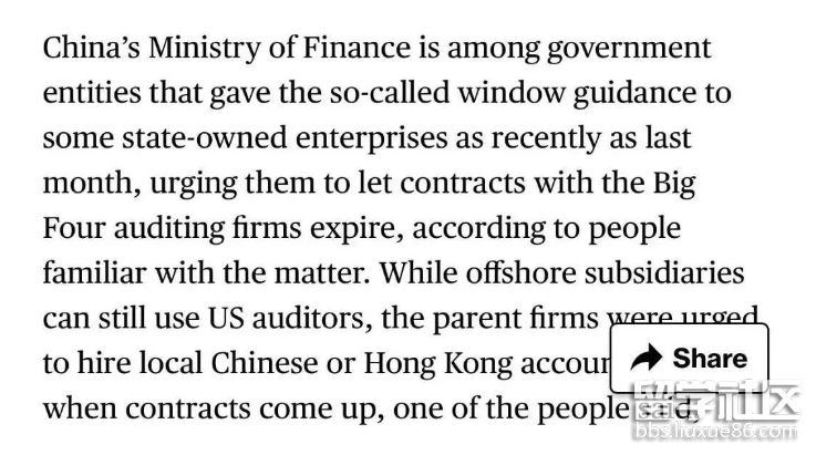 彭博社報(bào)道稱(chēng)援引消息人士的話(huà),財(cái)政部在上個(gè)月向一些國(guó)有企業(yè)給出了“窗口指導(dǎo)”建議,敦促他們終止與四大會(huì)計(jì)師事務(wù)所的合同。雖然海外子公司仍然可以聘用美國(guó)審計(jì)師,但官方已經(jīng)建議國(guó)企母公司在與“四大”會(huì)計(jì)師事務(wù)所的合同到期后聘請(qǐng)中國(guó)內(nèi)地的或中國(guó)香港的會(huì)計(jì)師事務(wù)所。