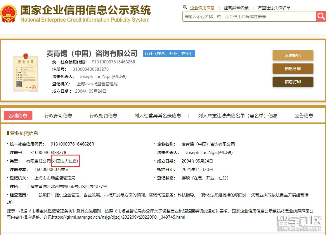 在這里教大家識(shí)別是否為外資或者合資企業(yè)的一個(gè)方法。大家在國(guó)家企業(yè)信用信息公示系統(tǒng)里查詢(xún)企業(yè)的工商注冊(cè)信息時(shí),外商獨(dú)資或者合資企業(yè)一般都會(huì)在公司類(lèi)型里有注明。比如,麥肯錫(中國(guó))咨詢(xún)有限公司在國(guó)家企業(yè)信用信息公示系統(tǒng)里的信息顯示如下: