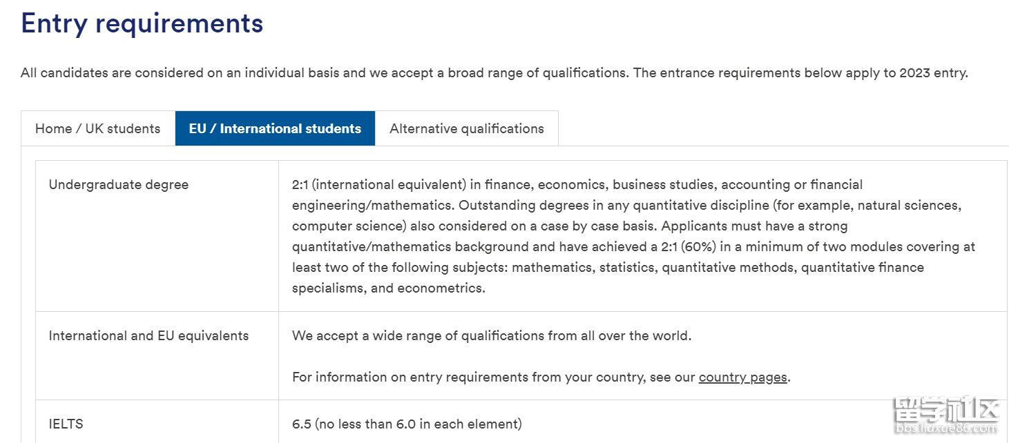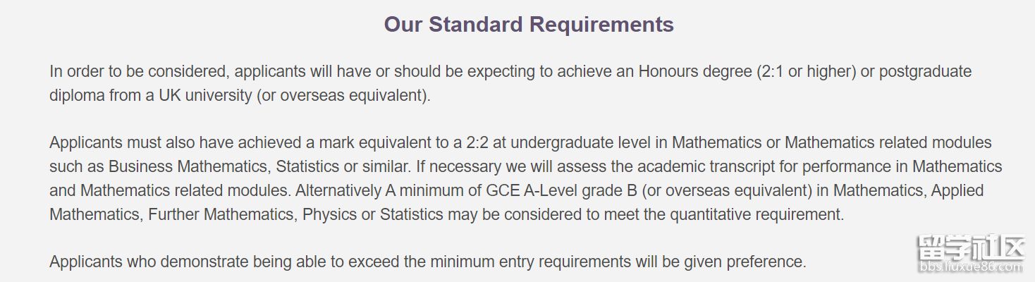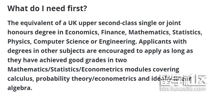 要求金融、經(jīng)濟(jì)學(xué)、商業(yè)研究、會(huì)計(jì)或金融工程/數(shù)學(xué)相關(guān)專(zhuān)業(yè);任何定量學(xué)科(計(jì)算機(jī)、自然科學(xué))的優(yōu)秀學(xué)位也根據(jù)情況考慮。申請(qǐng)人必須有強(qiáng)大的定量/數(shù)學(xué)背景,并至少在涵蓋以下學(xué)科的兩個(gè)科目中達(dá)到2:1:數(shù)學(xué)、統(tǒng)計(jì)學(xué)、定量方法、定量金融和計(jì)量經(jīng)濟(jì)學(xué)。