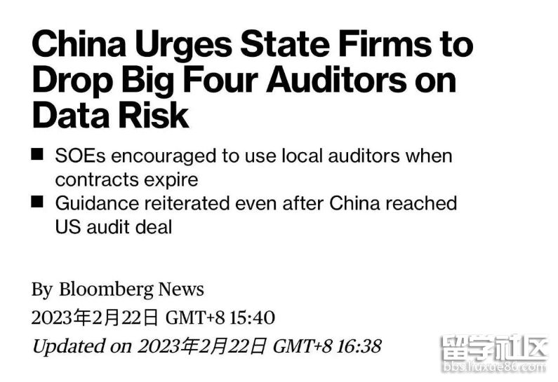 北美當(dāng)?shù)貢r(shí)間2023年2月22日,彭博社報(bào)道稱(chēng),根據(jù)消息人士的信息,中國(guó)政府由于數(shù)據(jù)安全的風(fēng)險(xiǎn)敦促?lài)?guó)有企業(yè)放棄與“四大”會(huì)計(jì)師事務(wù)所的合作。
