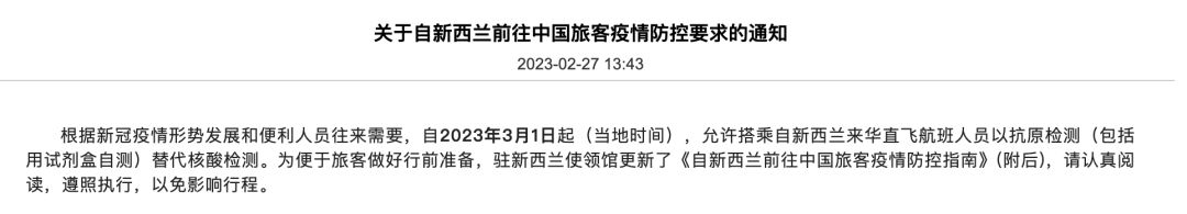 自3月1日起,包括新西蘭,新加坡,埃及等多個國家的中國大使館已經(jīng)宣布允許搭乘自新西蘭來華直飛航班人員以抗原檢測(包括用試劑盒自測)替代核酸檢測。