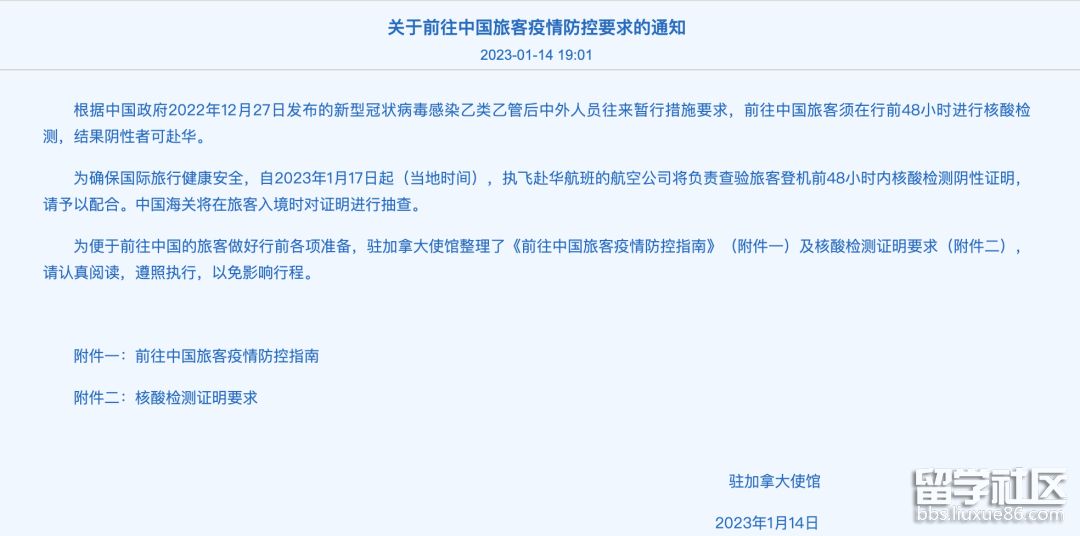 自2023年1月5日起,所有經(jīng)中國大陸、香港特別行政區(qū)及澳門特別行政區(qū)入境加拿大的2歲以上旅客,需在登機前提供48小時新冠檢測陰性證明(限制對象不限國籍,不限是否注射疫苗)。