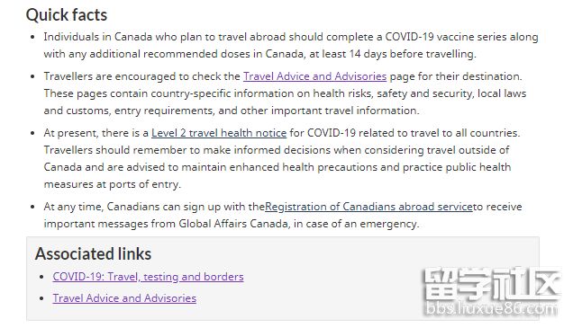 目前,針對COVID-19的2級旅行健康通告與前往所有國家的旅行有關(guān)。旅行者在考慮到加拿大境外旅行時,應(yīng)記住做出明智的決定,并建議在入境口岸保持加強的健康預(yù)防措施并采取公共衛(wèi)生措施。