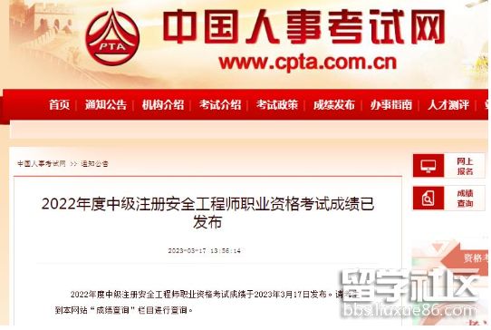 2022年度中級注冊安全工程師職業(yè)資格考試成績于2023年3月17日發(fā)布。請考生到中國人事考試網(wǎng)網(wǎng)站“成績查詢”欄目進行查詢。