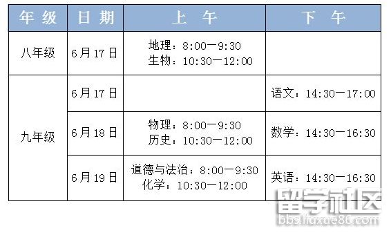 九年級(jí)參加的初中學(xué)業(yè)水平考試科目包括語(yǔ)文、數(shù)學(xué)、英語(yǔ)、道德與法治、歷史、物理、化學(xué)、體育等;八年級(jí)參加的初中學(xué)業(yè)水平考試科目包括生物和地理兩科。