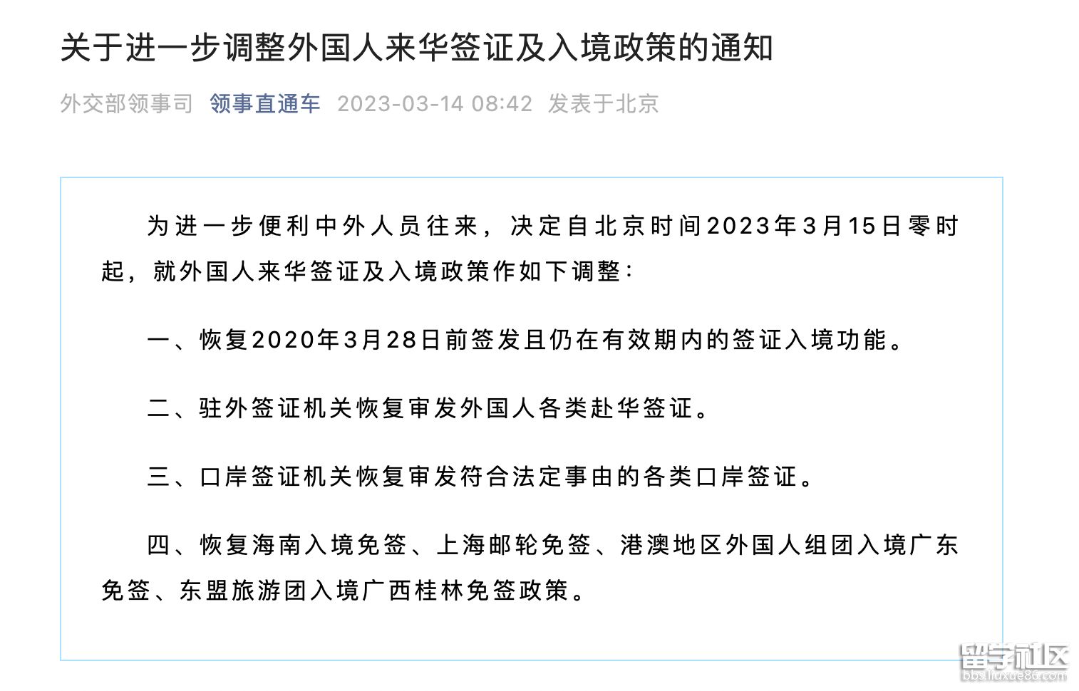 外交部領事司微信公眾號“領事直通車”14日發(fā)布,為進一步便利中外人員往來,決定自北京時間2023年3月15日零時起,就外國人來華簽證及入境政策作如下調整: