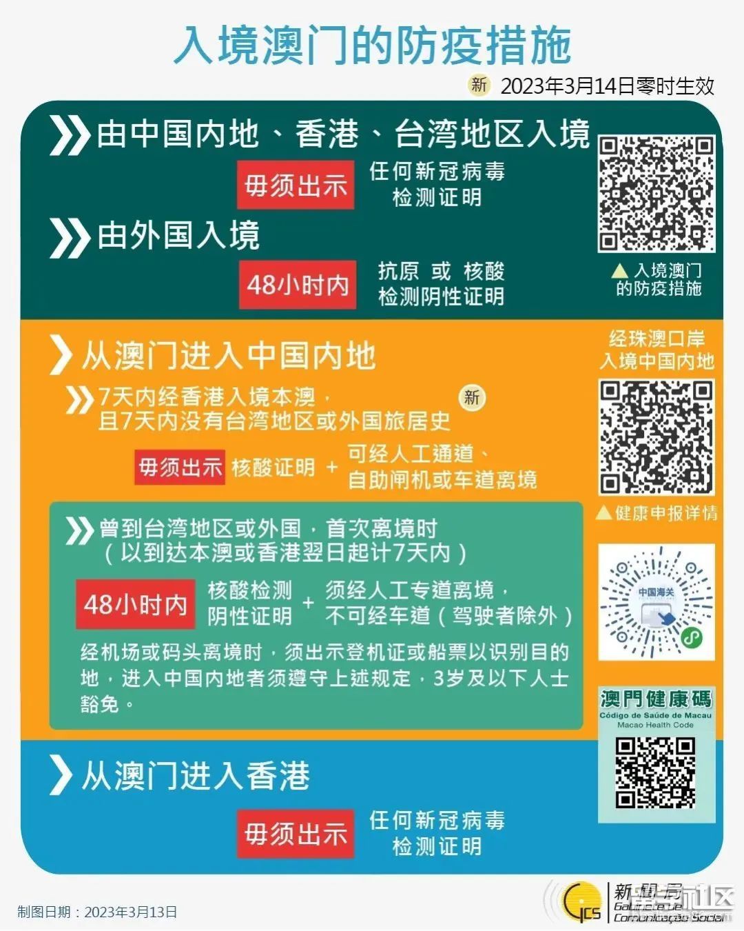 澳門應變協(xié)調中心宣布,3月14日零時起取消從澳門離境前往內地時須經(jīng)人工專道的要求,按照新措施,以到達澳門翌日起計7天內,由香港特區(qū)入境澳門,但沒有7天內臺灣地區(qū)或外國旅居史的人士,不論是否前往內地,皆可按一般方式離境(即一般人工信道、自助閘機或車道)而無須出示澳門健康碼或核酸檢測陰性報告。
