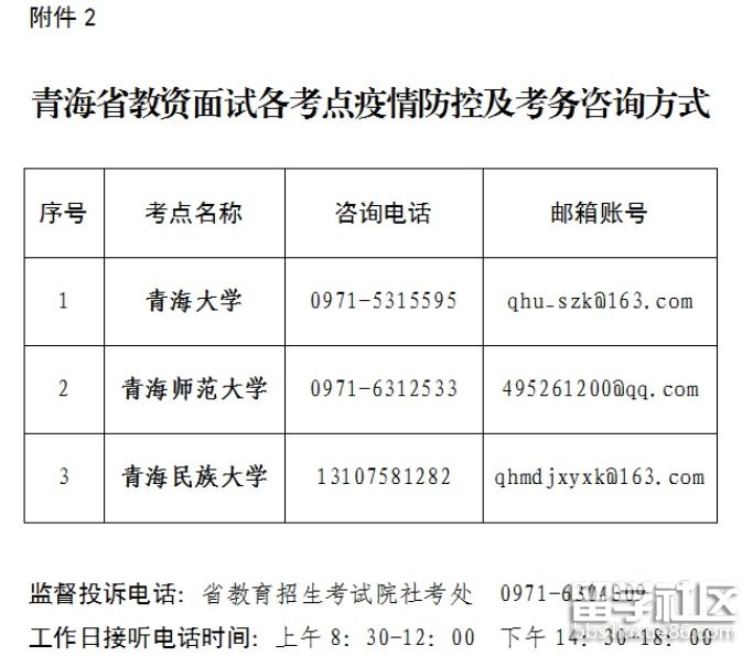 2.青海省教資面試各考點(diǎn)疫情防控及考務(wù)咨詢(xún)方式