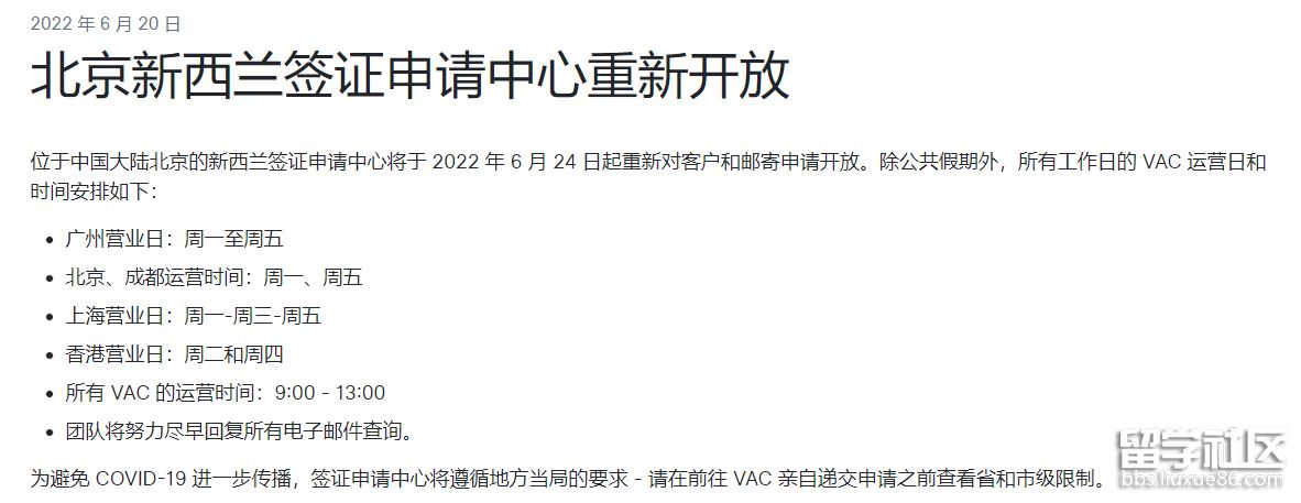 新西蘭位于北京的簽證中心于6月24日恢復(fù)運(yùn)營(yíng),位于上海的簽證中心已于6月10日開(kāi)放。