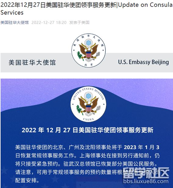 美國(guó)駐華大使館曾經(jīng)在12月14日表示,美國(guó)駐華(北京)大使館和美國(guó)駐上海總領(lǐng)事館只提供護(hù)照和緊急公民服務(wù)。美國(guó)駐武漢、沈陽(yáng)和廣州總領(lǐng)事館將只提供緊急領(lǐng)事服務(wù),直至另行通知。除上??傤I(lǐng)事館已計(jì)劃提供的部分簽證服務(wù)外,所有常規(guī)簽證服務(wù)暫停;駐北京大使館和其他總領(lǐng)事館的所有常規(guī)預(yù)約都已取消。