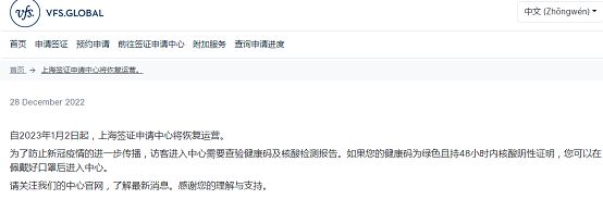 又如VFS Global挪威簽證申請(qǐng)中心的信息顯示,其北京簽證申請(qǐng)中心于2022年12月21日起恢復(fù)運(yùn)營(yíng),廣州簽證申請(qǐng)中心于2022年12月27日起恢復(fù)運(yùn)營(yíng),而沈陽(yáng)簽證申請(qǐng)中心于2022年12月28日起恢復(fù)運(yùn)營(yíng)。