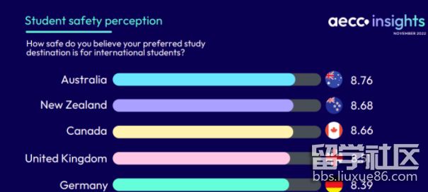 報告顯示,在“你認為相對更安全的留學目的”的問答中,澳大利亞獲得總評8.76分(滿分10分)位居第一,此外,前五名還依次包括了:新西蘭、加拿大、英國、德國。而美國也被選為被認為是最不安全的目的地。