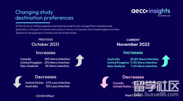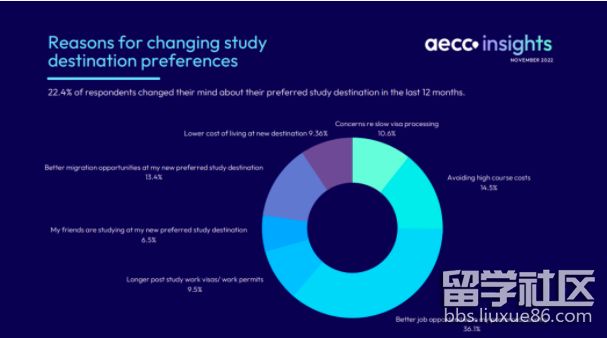 報告指出,有3169名受訪者(22.4%)改變了他們的學習目的地,他們更喜歡澳大利亞、英國和新西蘭。