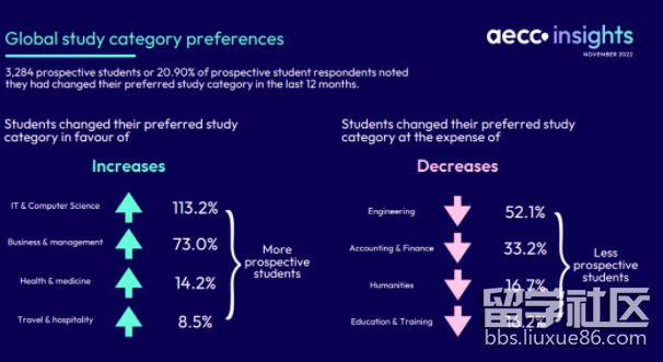 調(diào)查還發(fā)現(xiàn),一些學生希望轉(zhuǎn)換學習領域。選擇IT和計算機科學專業(yè)增長了113.2%,商業(yè)和管理增長了73%,健康和醫(yī)學增長了14.2%,旅游和酒店業(yè)增長了8.5%。而工程、會計金融、人文、教育專業(yè)意向人數(shù)略有下降。