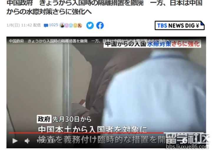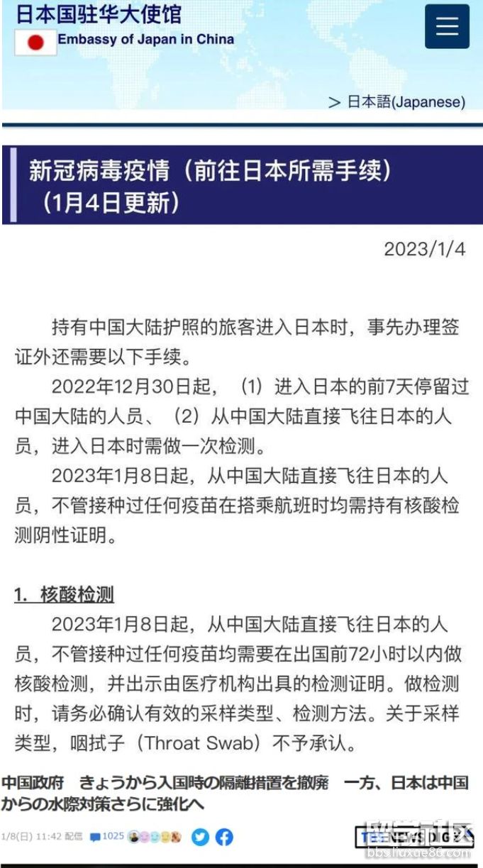 據日本官方此前發(fā)布的消息,日本從1月8日起要求從中國入境日本的旅客,不管接種過任何疫苗,均需要在出國前72小時以內做核酸檢測,并出示由醫(yī)療機構出具的核酸檢測證明。進入日本前7天內有停留過中國大陸的人員以及從中國大陸直接飛往日本的人員到達日本時,需接受檢測,檢測結果若呈陽性則將被隔離。