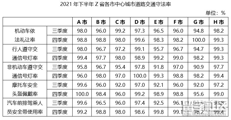 113.如用求各市算術(shù)平均值的方式計(jì)算全省數(shù)值,則2021年四季度Z省中心城市道路汽車前排駕乘人員安全帶使用率比上季度: