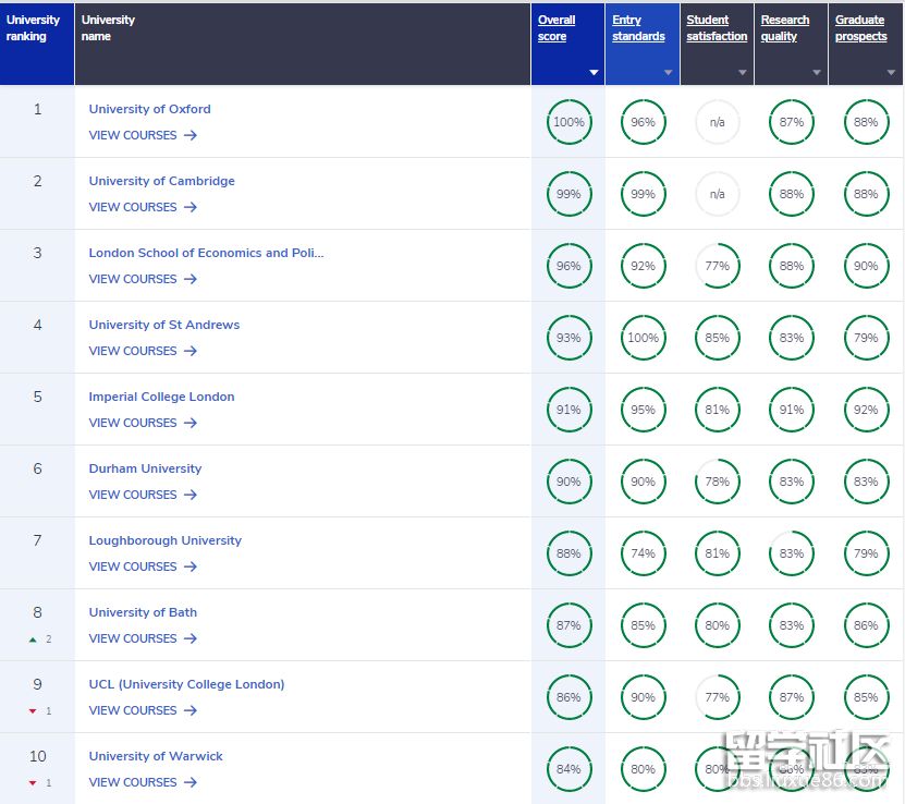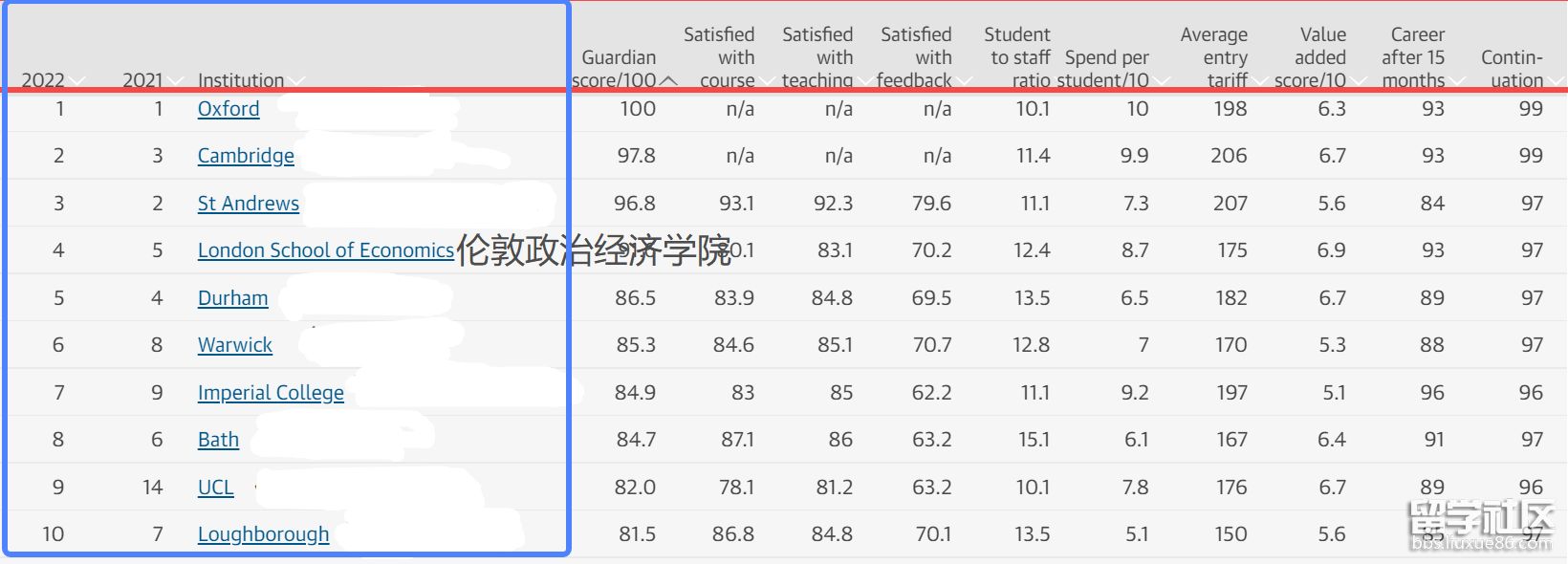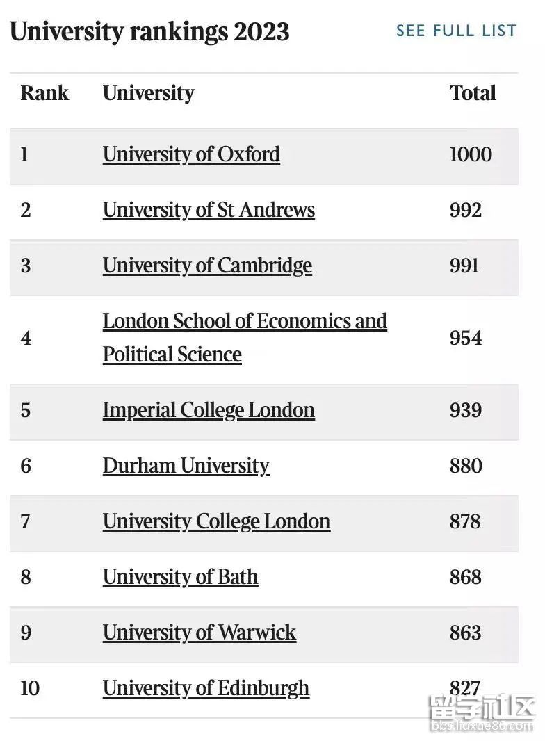 2023年排名前7位的大學(xué)與去年一致沒有發(fā)生變化,分別是:牛津大學(xué)、劍橋大學(xué)、倫敦政治經(jīng)濟(jì)學(xué)院、圣安德魯斯大學(xué)、帝國理工學(xué)院、杜倫大學(xué)、拉夫堡大學(xué)。