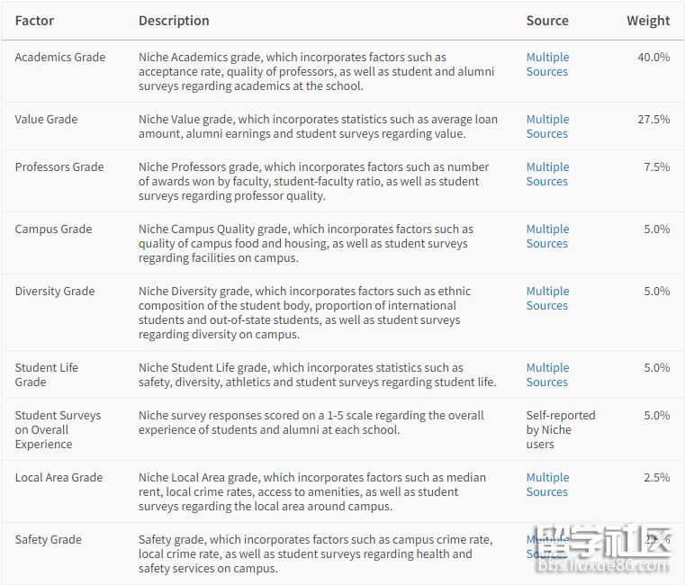 在參考的指標(biāo)以及各個指標(biāo)的權(quán)重上,Niche參考了9項指標(biāo),它們各自占的比重分別為:
