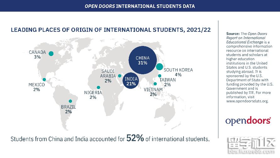 受疫情影響,2021-2022學(xué)年中國(guó)在美留學(xué)生人數(shù)下降了9%,比2020-2021學(xué)年15%的降幅略低。盡管中國(guó)留學(xué)生人數(shù)連續(xù)兩年下跌,中國(guó)依然是赴美留學(xué)最大的生源地,占國(guó)際學(xué)生總?cè)藬?shù)的31%。