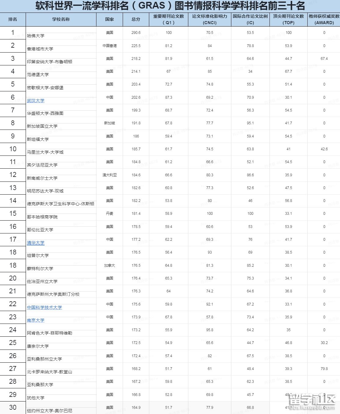 2022年圖書情報(bào)科學(xué)軟科世界一流學(xué)科排名top30