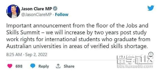 就在2022年9月,澳大利亞教育部長(zhǎng)Jason Clare正式宣布延長(zhǎng)485簽證的工作權(quán)利期限,畢業(yè)生能停留4-6年更久的時(shí)間。