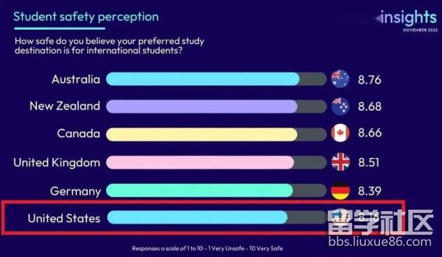 與此同時(shí),更少同學(xué)意向赴加拿大和美國(guó)留學(xué)。美國(guó)留學(xué)已經(jīng)連續(xù)兩年降溫,降溫原因跟中美關(guān)系、安全問(wèn)題、疾病風(fēng)險(xiǎn)等多方面問(wèn)題相關(guān)。美國(guó)此次也被同學(xué)們選為了 “最不安全”的留學(xué)國(guó)。