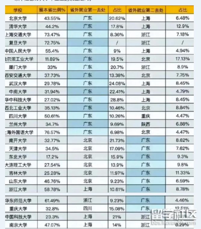 再往后,則是南京大學(xué)、東南大學(xué)、清華大學(xué)、北京大學(xué),在本省市就業(yè)率超過40%。清華、北大不必再說,南京大學(xué)和東南大學(xué)的高留本省率的背后,則是江蘇發(fā)達(dá)經(jīng)濟(jì)實(shí)力的有力支撐。