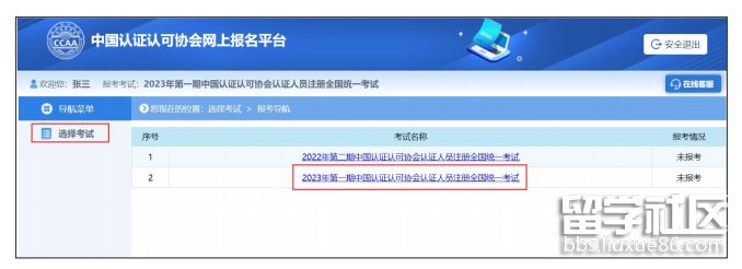 點擊左側(cè)菜單欄“選擇考試”,進入選擇考試頁面。從考試列表中選擇當前時 間段允許報名的考試,點擊考試名稱。