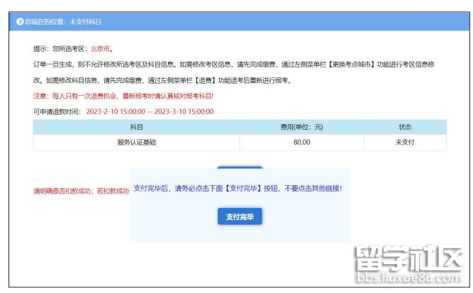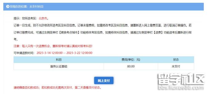 注意:若還未支付,如需修改考區(qū)及科目信息,請重新進入網(wǎng)上繳費頁面,點擊 “取消訂單”按鈕,再重新選擇科目信息、選擇考區(qū)、網(wǎng)上繳費操作。如需修改 考區(qū)信息,請先完成繳費,通過左側(cè)菜單欄【更換考點城市】功能進行考區(qū)信息 修改。繳費完成后,通過左側(cè)菜單欄【退費】功能退考后,可重新進行報考(每 人只有一次退費機會,重新報考時請認真核對報考科目?。?。
