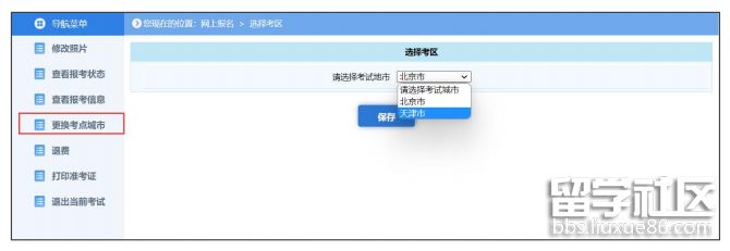 點擊左側(cè)菜單欄“更換考點城市”,進入更換考點城市頁面。下拉選擇將要變 更的考區(qū),點擊“保存”按鈕。