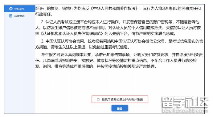 認真閱讀報考須知,確保充分知曉考試相關(guān)規(guī)定和要求,勾選“我已了解并知 悉上述內(nèi)容并承諾”后,點擊“接受”按鈕。