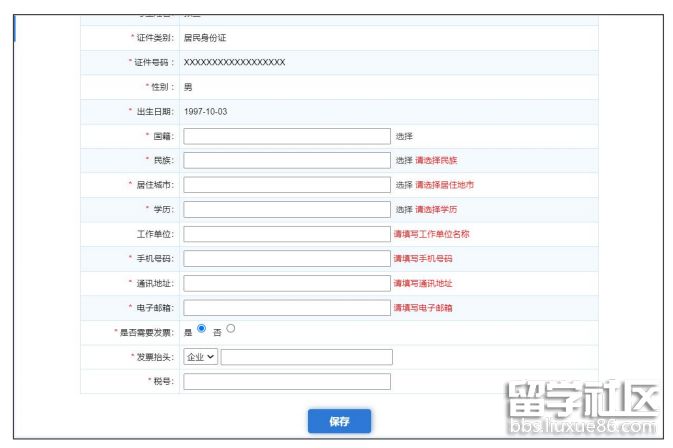 (1)按頁面提示要求填寫報名信息,標“*”的部分為必填項,填寫完成后請 仔細核對,確保無誤后點擊“保存”按鈕,保存成功后跳轉(zhuǎn)到報考流程頁面。