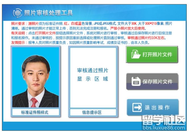 (2)請考生提前準備源文件為標準證件數(shù)字照片,格式為 JPG 或 JPEG,紅 色、白色或藍色背景,源文件大于 30K,像素大于 300*215 的個人證件照片。并 仔細閱讀照片要求及有關(guān)說明,點擊下載“照片審核處理工具”,解壓后點擊“照 片審核處理工具”。