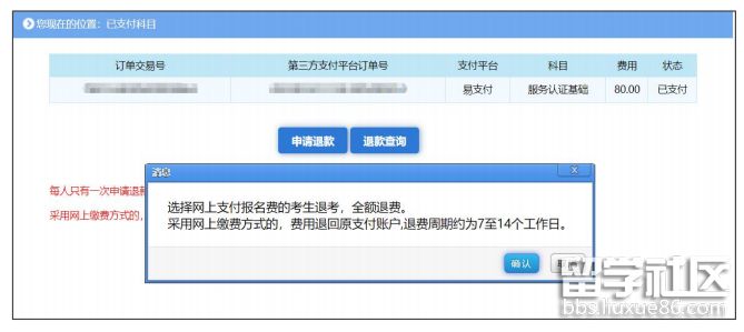 (2)仔細閱讀頁面提示內(nèi)容,如確認退費,點擊“申請退款”按鈕,彈框提示 二次確認信息,點擊“確認”按鈕即可提交退費申請。退費時間可能較長,請耐 心等待退費結(jié)果。