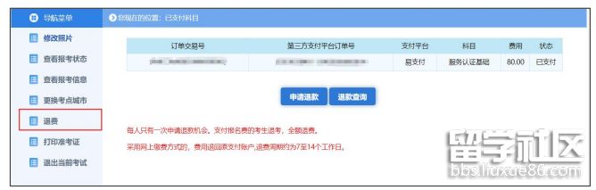 注意:每人只有一次申請退款機會。支付報名費的考生退考,全額退費。