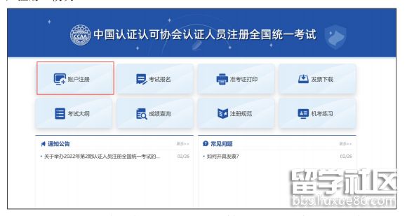 (1)登錄中國認證認可協(xié)會認證人員注冊全國統(tǒng)一考試報名網(wǎng)站,點擊“賬 戶注冊”模塊。