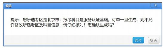 (2)進入繳費頁面后,仔細核對報考考區(qū)及報考科目信息,認真閱讀繳費 頁面提示內(nèi)容,確認無誤后點擊“網(wǎng)上支付”按鈕,彈框提示確認信息,二次確 認無誤后點擊“支付”按鈕即可生成訂單。
