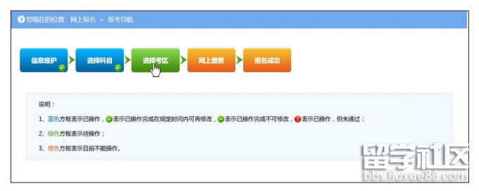 (2)報考流程中“選擇考區(qū)”功能模塊變?yōu)樗{色,代表當前流程已完成。