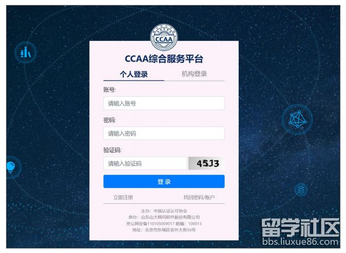 (2)進入登錄頁面后,選擇“個人登錄”模塊,輸入賬號、密碼、圖形驗證 碼,點擊“登錄”按鈕登錄。同時可通過該頁面右下方“找回密碼/賬戶”功能, 完成賬戶信息找回操作。