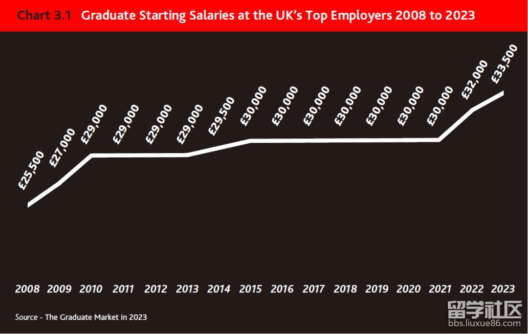 但在2022年-2023年,畢業(yè)生起薪連續(xù)兩年增長,預(yù)計(jì)2023年畢業(yè)生起薪將達(dá)到為33,500英鎊。