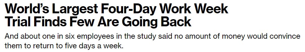 并且Bloomberg報(bào)道,參與四天制試驗(yàn)的企業(yè)和員工,都對這項(xiàng)革新制度非!常!滿!意!